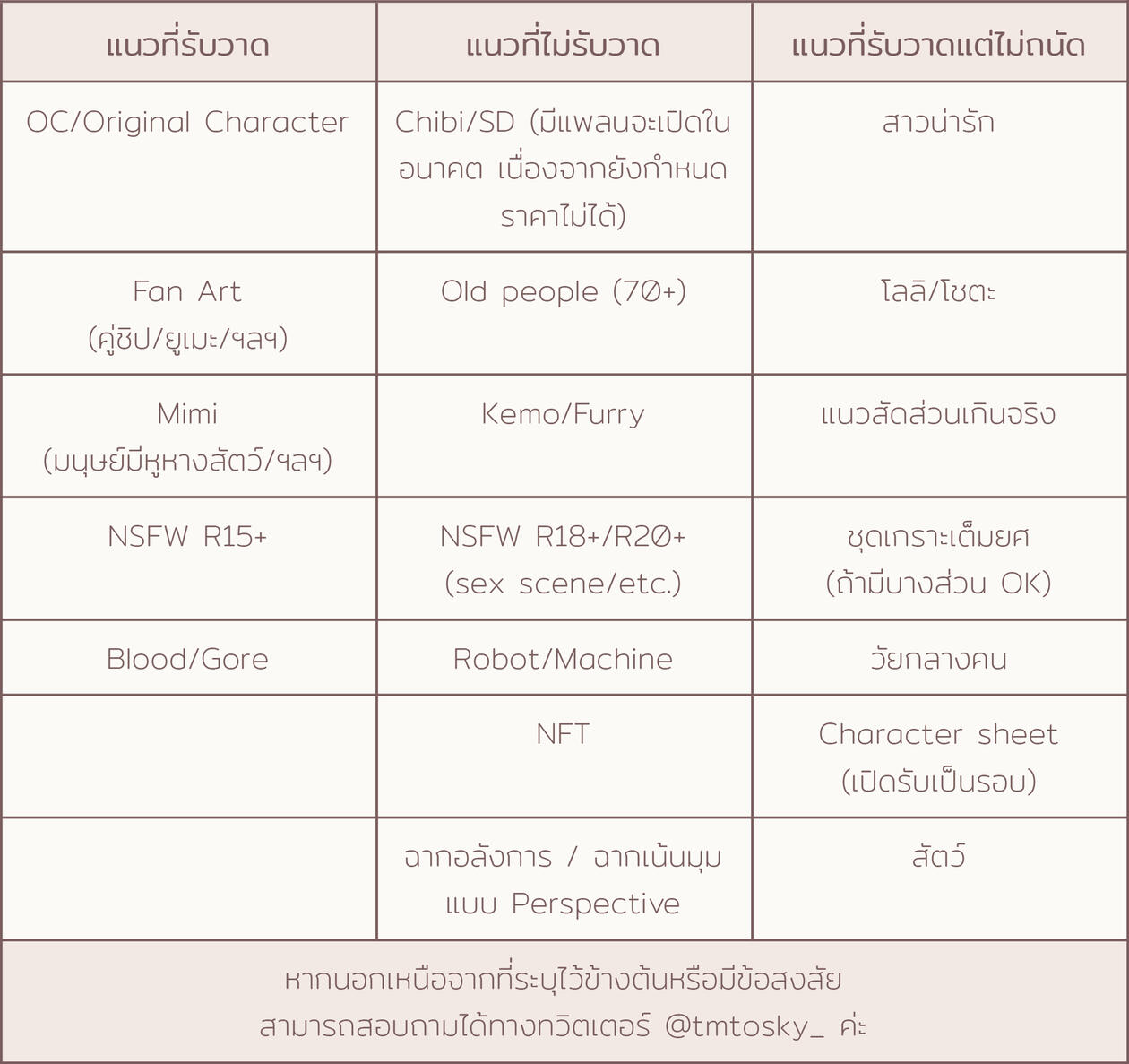 ✦ นับคิวหลังโอนค่ามัดจำ 50% เท่านั้น✦ กรณีใช้งานเชิงพาณิชย์จะเพิ่มราคา x 2 จากราคาเดิม✦ สำหรับผู้ที่จ่ายในราคาเชิงพาณิชย์ สามารถขายภาพต่อได้ในราคาที่ต่ำกว่าที่ซื้อ และสำหรับผู้ที่จ่ายในราคาปกติ สามารถเปลี่ยนเจ้าของภาพได้โดยไม่ต้องแจ้งทางนักวาด (ขอแค่ไม่เอาไปใช้เชิงพาณิชย์ก็เป็นพอ ขอบคุณค่ะ)✦ ไม่อนุญาตให้นำไปใช้เป็น NFT ไม่ว่ากรณีใดก็ตาม✦ ก่อนนำภาพไปเป็นตัวอย่าง Commission หรือโพสลงโซเชียลทางเราจะสอบถามลูกค้าทุกครั้ง หากไม่สะดวกแจ้งได้ค่ะ✦ โปรดเข้าใจว่าคุณภาพตามราคางาน เช่น ในกรณีที่เป็นงานประเภทเส้นรัฟ / Flat color แต่ลูกค้าต้องการให้เก็บละเอียดบางส่วน เช่น เส้นผม สีผิว ฯลฯ ต้องจ่ายเพิ่มในราคา 50+ บาทโดยนักวาดจะพิจารณาราคาตามส่วนและความเหมาะสม✦ ในกรณีที่ลูกค้าสั่งภาพสีแต่ต้องการไฟล์เส้นเปล่า ต้องจ่ายเพิ่มในราคา 150 บาท (แนะนำให้แจ้งล่วงหน้าในขั้นตอนการบรีฟค่ะ เพราะในบางงานเรารวม Layer เส้นกับสีเข้าด้วยกันเพื่อความสะดวกในการทำงาน)✦ ผลงานจ้างเป็นของลูกค้า สามารถใช้งานได้ตามขอบเขตการว่าจ้างที่ตกลงกันไว้ (แยกกรณีเชิงพาณิชย์และใช้ส่วนตัว) ทั้งนี้ จะแปะเครดิต @tmtosky_ หรือไม่ก็ได้ตามที่ท่านสะดวก แต่ไม่อนุญาตให้แอบอ้างผลงานเป็นอันขาด